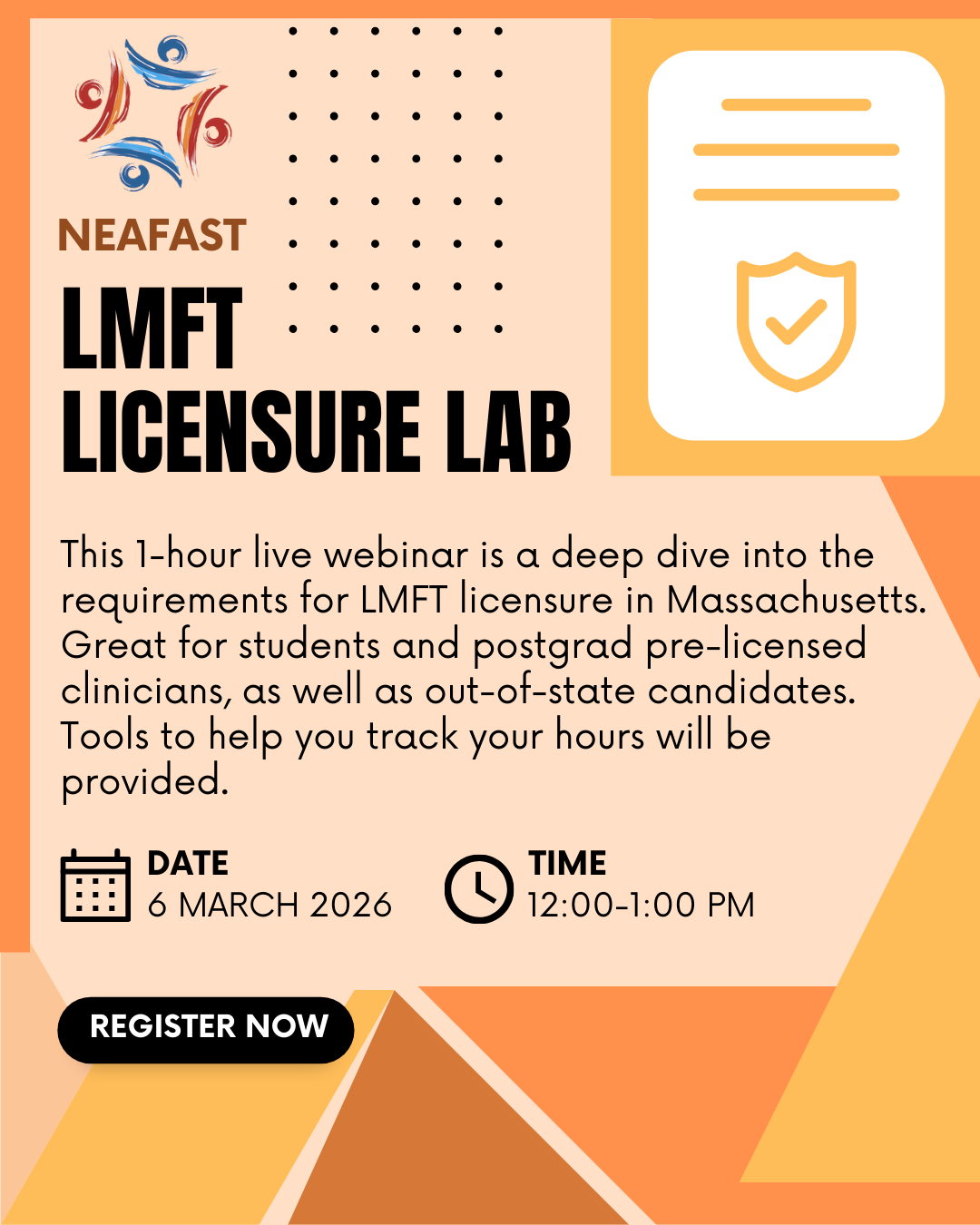 ![]() About: This 1-hour webinar is a deep dive into the requirements for LMFT licensure in the Commonwealth of Massachusetts. We’ll review the regulations in detail, including academic, clinical field experience, and supervision requirements. We’ll also provide tools to help you track your hours, and answer your questions about the application process. Appropriate for students and Master's-level pre-licensed professionals alike, as well as those seeking reciprocal licensure from outside Massachusetts. Cost: First time is FREE for student and pre-licensed members (with a $20 retake fee). Clinical members who want a refresher course or out-of-state candidates wanting to understand the process can attend for $50. Disclaimer: This course is intended to provide only information and guidance to potential LMFT applicants. Licensure approval is at the sole discretion of the MA Board of Registration of Allied Mental Health and Human Services Professions. NEAFAST makes no assurances or guarantees of acceptance. |